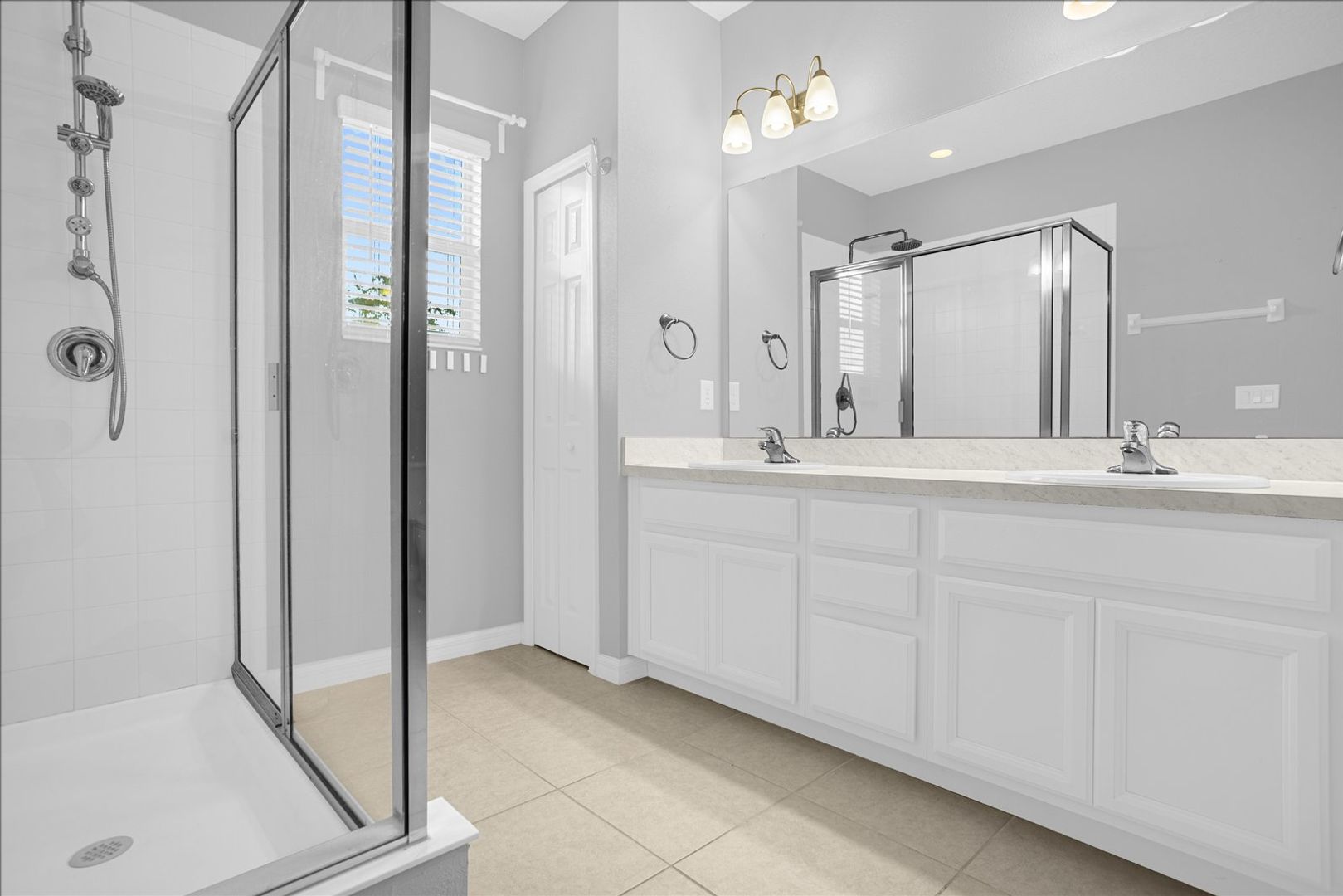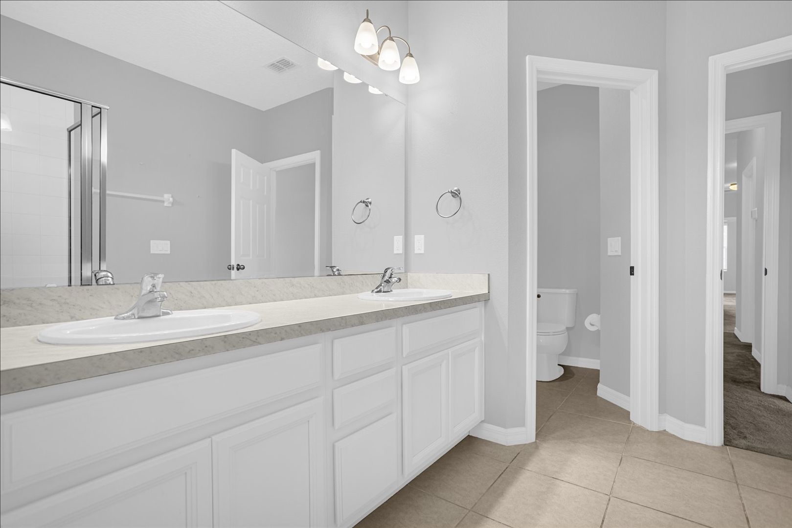 Upstairs, the split staircase provides a private entryway to the owner’s suite, complete with a generous walk-in closet and a spa-inspired bathroom with dual sinks and a separate glass-enclosed shower. Two additional bedrooms and a full bath ensure comfort for family members, guests, or work-from-home needs.