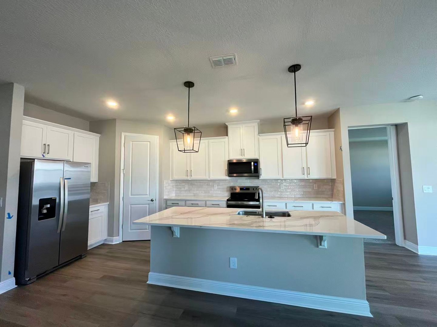 The modern gourmet kitchen overlooks the great room, dining area, and covered lanai, creating a bright and welcoming central living space. Large windows and smart design maximize natural light and functionality, while the flexible layout provides plenty of room for family, guests, or a home office.